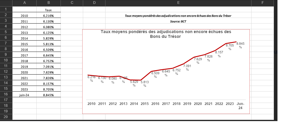 Nous sommes actuellement à 21 mois avec un taux directeur record de 8 %. Conjugué à un rythme inédit d’émissions de Bons du Trésor, l’encours des titres de créances de l’Etat a dépassé 26 433 MTND fin juin 2024. De plus, il est majoritairement composé de Bons à court terme. Ce qui augmente mécaniquement la charge financière supportée par le Budget de l’Etat.