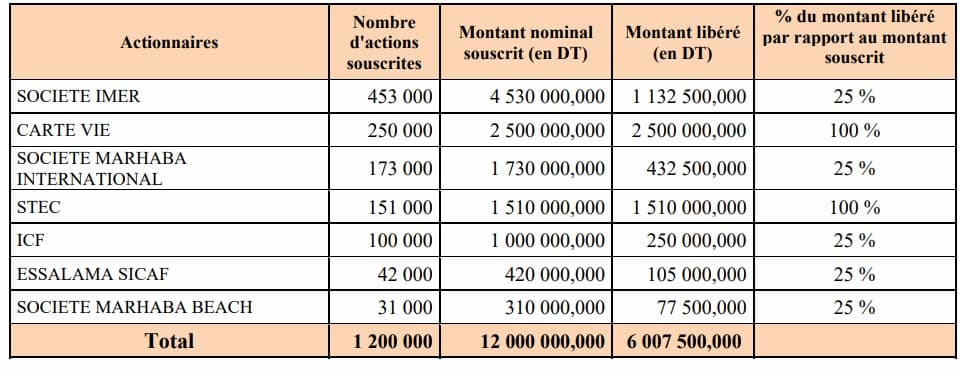 Le capital social de la société se compose désormais de 3 947 253 actions nominatives, chacune d’une valeur nominale de 10 DT. À la suite de cette augmentation, l’article 6 des statuts de la société a été modifié pour refléter ces changements.