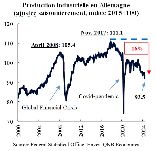 La production automobile, l’une des industries phares de l’Allemagne, est affectée par unchangement des préférences des consommateurs en faveur des véhicules électriques, des réglementations environnementales plus strictes et une pénurie de travailleurs qualifiés. La production automobile a chuté de 28 %, passant de 471 000 unités par mois en 2017 à 337 000 en 2024. Cela représente un défiimportant pour l’économie, étant donné que la fabrication automobile représente 5 à 7 % du PIB en Allemagne, contre 2 à 3 % aux États-Unis et en France. Compte tenu de l’importance de l’industrie manufacturière, ces tendances pèsent sur la performance de l’économie allemande.
