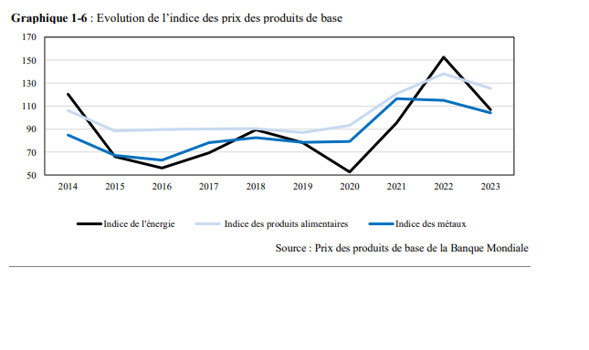 A l’horizon de 2024, les prix internationaux des produits de base devraient encore baisser, en rapport, surtout, avec le ralentissement de la croissance économique mondiale, dans un contexte marqué par l’effet du resserrement des conditions financières et par la faiblesse des échanges mondiaux, face à l’abondance de l’offre pour plusieurs produits. A cet égard, les prévisions de la Banque mondiale tablent sur une baisse des cours de l’ordre de 4,1% en 2024. Toutefois, il est à noter que ces prévisions supposent un impact limité du conflit au Moyen-Orient.
