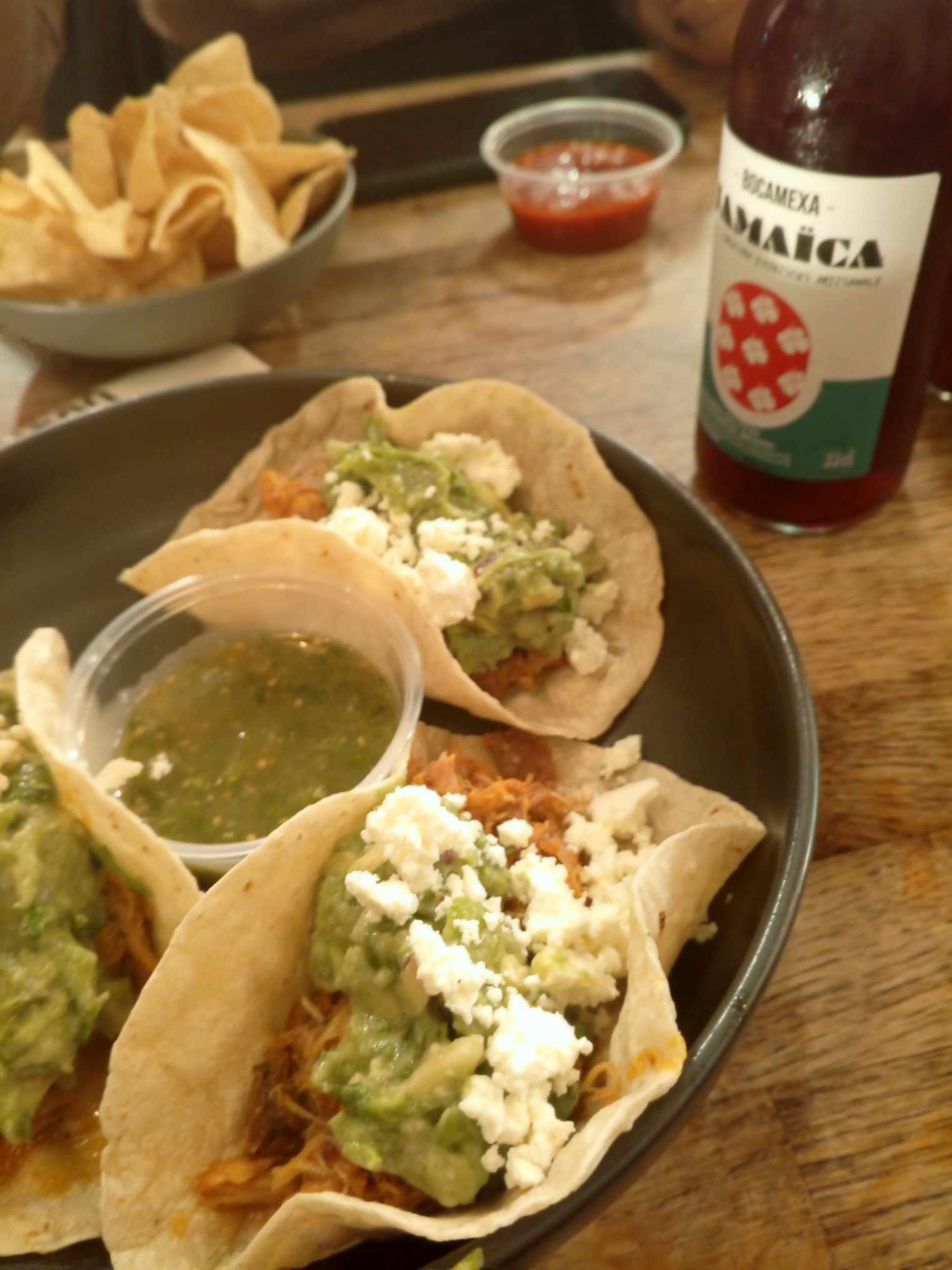 Nous nous sommes retrouvées à 18h30 à Créteil. Olfa est venue me chercher avec sa voiture — j’ai déposé ma valise bordeaux dans le coffre et nous avons pris la direction de la Bastille. En voiture, ça prend environ 15 minutes sans embouteillage (un vrai miracle à Paris !).  Comme j’ai toujours une faim bleue pour la cuisine mexicaine (je crois que je devrais envisager une carrière dans la gastronomie), j’ai décidé de me régaler avec Olfa au restaurant Bocamexa à la place de Bastille. Si vous êtes de passage à Paris, ne manquez pas cet endroit ! Burritos, tacos et quesadillas préparés avec des ingrédients frais  — c’est un vrai festin mexicain ! Bien sûr, j’ai opté pour des tacos accompagnés d’une boisson artisanale.
