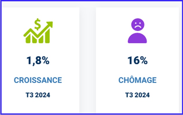 Parallèlement, le taux de chômage est resté stable à 16 % au troisième trimestre 2024, par rapport au trimestre précédent, mais il a légèrement augmenté par rapport au troisième trimestre 2023, où il était de 15,8 %.