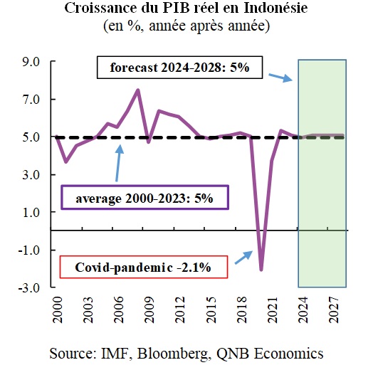 Au cours des dernières décennies, l’Asie du Sud-Est est devenue l’une des régions les plus dynamiques au monde, abritant certaines des économies à la croissance la plus rapide. Ce groupe inclut l’Indonésie, quatrième pays le plus peuplé au monde. Entre 2000 et 2023, le taux de croissance moyen des économies sud-asiatiques s’est établi à 5 %. Cette performance remarquable a été maintenue malgré une période de crises majeures, notamment la crise financière mondiale, la crise de la dette souveraine européenne et la pandémie de Covid-19. De plus, cette croissance s’est accompagnée d’une stabilité impressionnante, avec seulement trois années où la croissance était inférieure à 4 %.