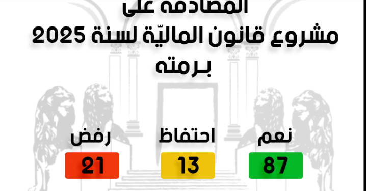 Cette approbation a eu lieu sous la présidence d’Ibrahim Bouderbala, président de l’Assemblée en présence de la ministre des Finances, Sihem Boughdiri Nemsia, ainsi que des responsables du ministère. Le projet de loi a recueilli 87 voix en faveur, tandis que 21 députés ont voté contre et 13 se sont abstenus.