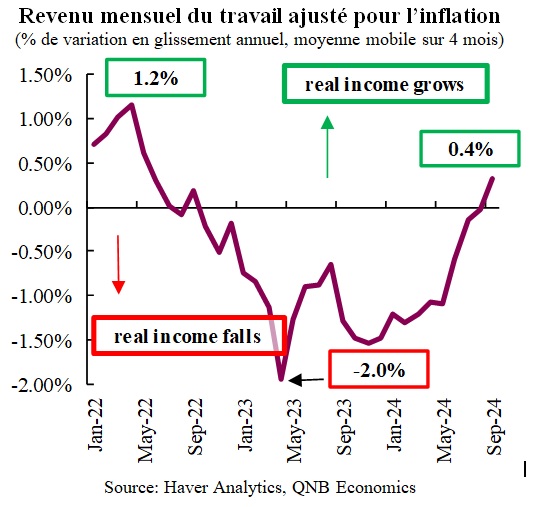 Premièrement, la croissance robuste des salaires devrait surpasser l’inflation, augmentant ainsi le revenu réel et favorisant une reprise de la consommation. L’inflation élevée des deux dernières années a érodé le pouvoir d’achat des ménages, entraînant une stagnation de la consommation, restée bien en deçà des niveaux moyens d’avant la pandémie (2018-2019).