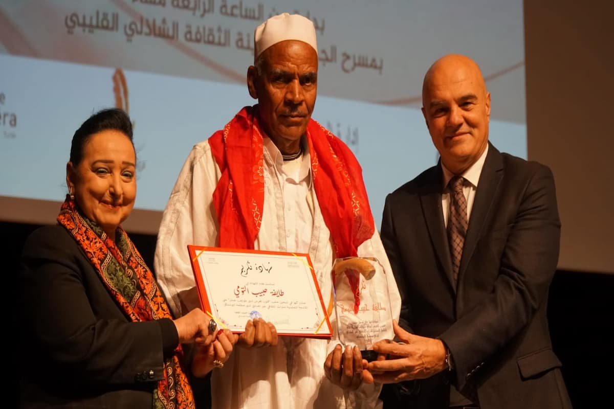 Les Twayef de Ghbonten, invités vedettes de cette célébration, ont offert une performance artistique immersive qui a transporté les spectateurs dans l’univers unique de ces troupes de poètes-chanteurs, affiliées à la tribu des Ghbonten. Vêtus de robes blanches et coiffés de chéchias écarlates, ils ont interprété leurs chants accompagnées du chenna, un tambour traditionnel.