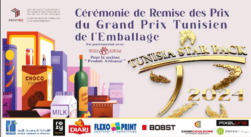 La cérémonie du Grand Prix Tunisien de l’Emballage « Tunisia Star Pack 2024 » a eu lieu le 24 décembre 2024 à Gammarth, sous l’égide du ministère de l’Industrie, des Mines et de l’Energie. Cet événement, organisé par le Centre Technique de l’Emballage et du Conditionnement (PACKTEC), a pour but de valoriser les efforts d’innovation dans le secteur de l’emballage, en mettant en avant la créativité et la qualité des produits tunisiens face à la concurrence internationale.