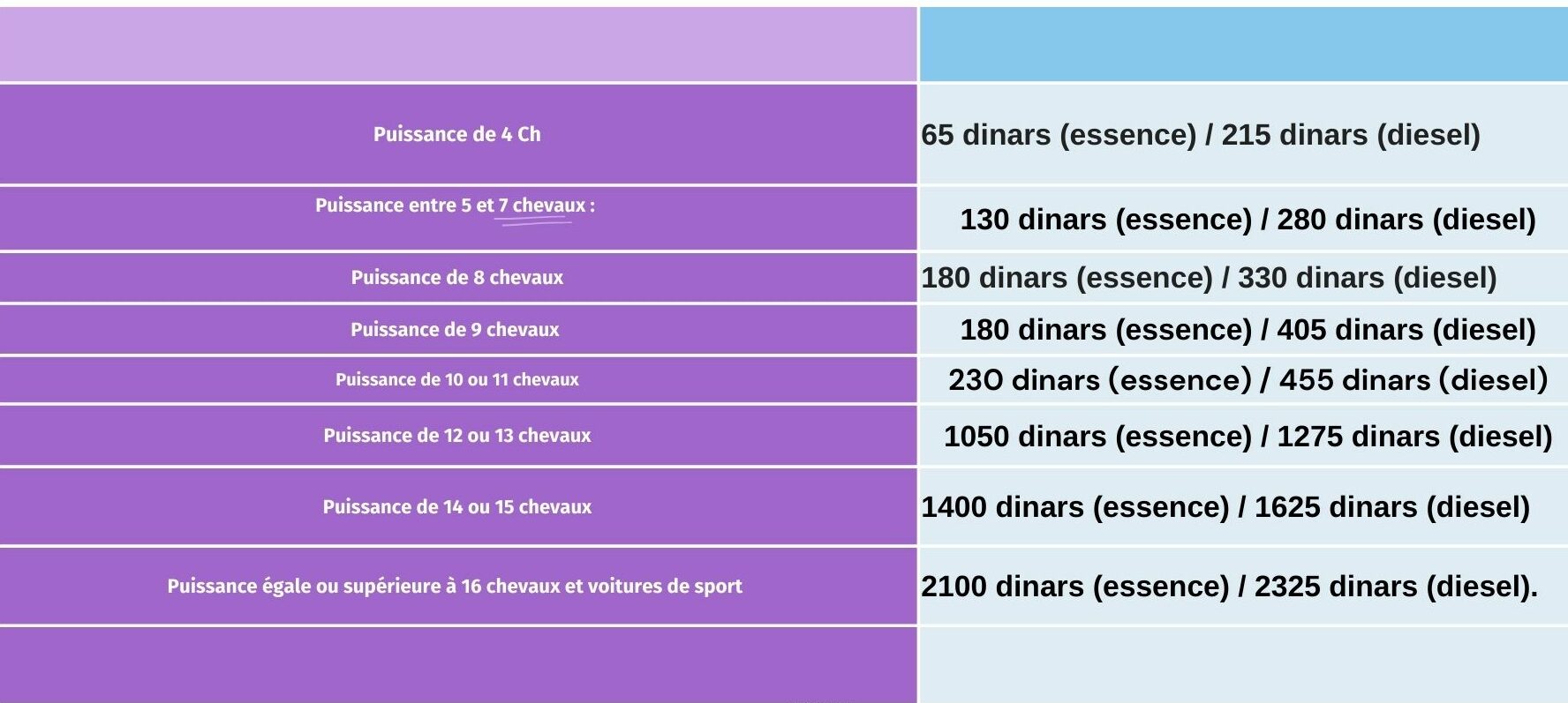 - Puissance de 4 chevaux : 65 dinars (essence) / 215 dinars (diesel)