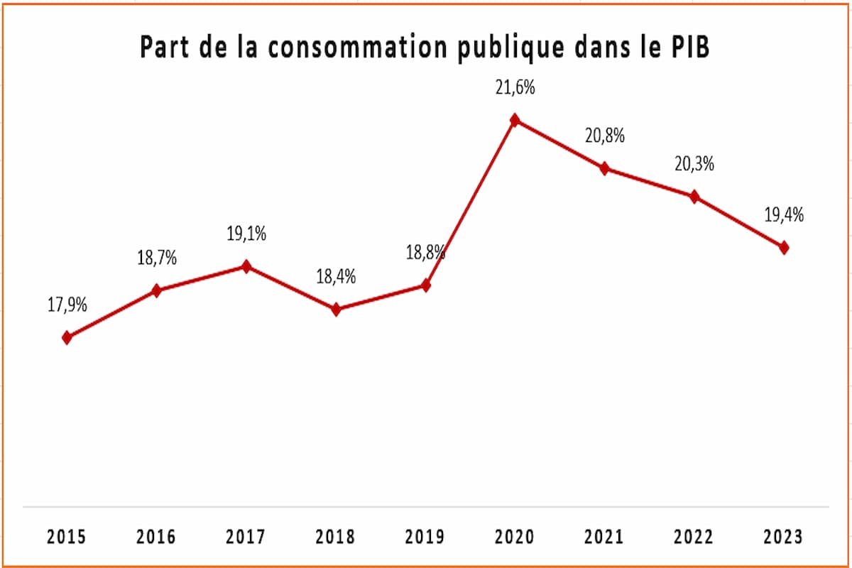 En chiffres, la consommation publique représente 19,4 % du PIB. Ce qui est dans la moyenne observée dans plusieurs pays. Sur les dernières années, elle a baissé, comme la tendance mondiale. Lors de la crise sanitaire, l’Etat a supporté des charges additionnelles. Ce qui avait porté la contribution au PIB de 18,8 % en 2019 à 21,6 % en 2020 et 20,8 % en 2021. Mais il faut bien se rappeler aussi que le PIB a chuté depuis, et nous sommes encore en dessous du PIB de 2019. Cela a aussi un rôle dans la montée rapide de la part de la consommation publique.