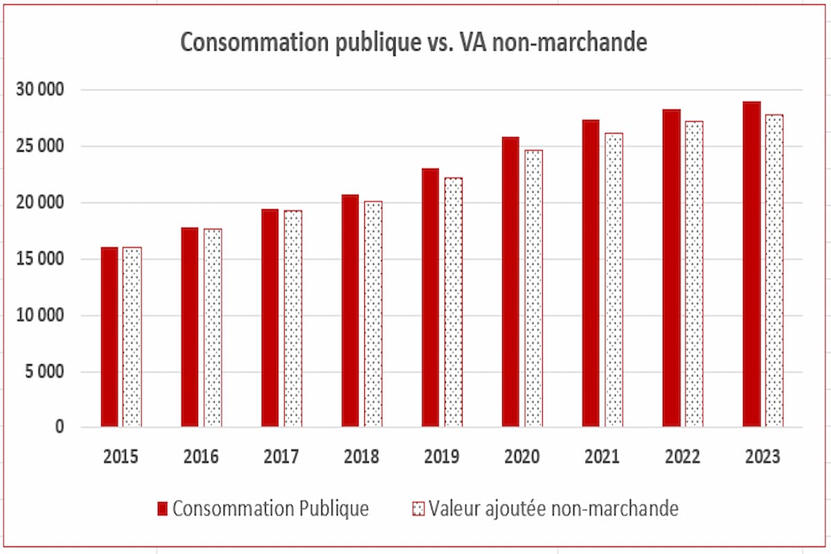 Pour mieux analyser, nous devons compléter cette image côté demande par celle de la production non-marchande. Cette dernière a enregistré un taux de croissance annuelle moyenne de 7,1 % entre 2015 et 2023. Ce qui demeure assez proche des 7,7 % de la consommation publique sur la même période. Et comme les rémunérations sont l’essentiel de la valeur ajoutée des activités non marchandes, nous comprenons que la consommation publique provient réellement du fonctionnement de l’appareil de l’Etat beaucoup plus que de la consommation de biens et services auprès des autres agents économiques.