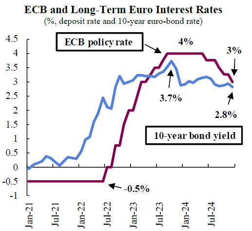 Troisièmement, les conditions financières restent restrictives en raison de la persistance de taux directeurs élevés et de la contraction progressive du bilan de la BCE. Le taux d’intérêt actuel de la facilité de dépôt, à 3 %, est proche d’un point de pourcentage au-dessus du taux considéré comme « neutre » pour l’économie, c’est-à-dire un niveau qui ne stimule ni ne freine l’activité économique. De même, bien que les taux d’intérêt à long terme aient baissé par rapport à leur pic d’octobre dernier, ils restent proches de leurs sommets de la dernière décennie. Ces taux, essentiels pour l’économie, influencent les investissements des entreprises et la demande des ménages. Par ailleurs, la BCE continue de réduire l’expansion de son bilan mise en place pendant la pandémie, une normalisation qui limite la disponibilité du crédit. En conséquence, en raison de la baisse de liquidités et de la hausse des coûts d’emprunt, les volumes de crédit continuent de se contracter en termes réels, signalant à la BCE que les conditions monétaires sont excessivement restrictives.