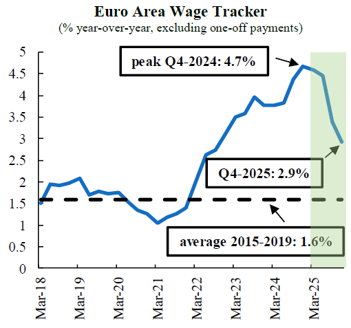 Premièrement, avec des prix déjà sous contrôle, le risque d’une inflation tombant bien en dessous de l’objectif de la BCE augmente. Les dernières données sur les prix à la consommation montrent que l’inflation mensuelle, en termes annualisés, est déjà inférieure à l’objectif de 2 % de la politique monétaire. En outre, l’inflation suit une tendance à la baisse qui pourrait l’éloigner encore davantage de l’objectif. L’enquête des prévisionnistes professionnels de la BCE prévoit déjà des taux d’inflation de 1,9 % pour 2025 et 2026.