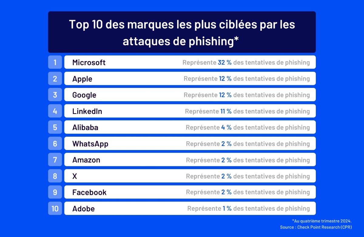 Voici le top 10 des marques les plus ciblées par les attaques de phishing dans le monde, au quatrième trimestre 2024 :