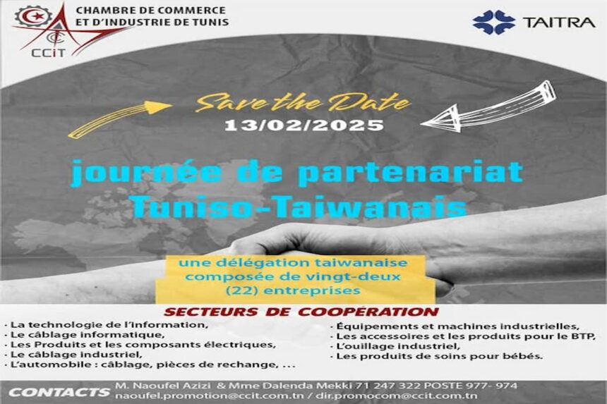 La Chambre de commerce et d’industrie de Tunis (CCIT) et le Taiwan Trade Center Algiers (TAITRA) organisent une Journée de partenariat entre la Tunisie et Taiwan. Cet événement aura lieu le jeudi 13 février 2025 dans un hôtel à Tunis.