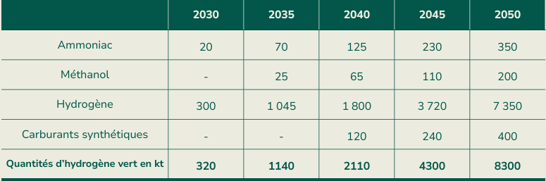 Le tableau suivant, issu de la stratégie nationale pour le développement de l’hydrogène vert et ses dérivés en Tunisie, rappelle l’évolution des quantités (kt) d’H2 transportées par pipelines, que ce soit pour l’export ou la consommation locale :