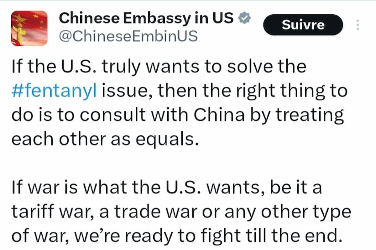 « Si les États-Unis veulent la guerre, qu’il s’agisse d’une guerre tarifaire, d’une guerre commerciale ou de tout autre type de guerre, nous sommes prêts à nous battre jusqu’à la fin », a déclaré l’ambassade de Chine à Washington dans un post sur X mercredi 5 mars 2025, signalant une position de plus en plus agressive à l’égard des États-Unis.