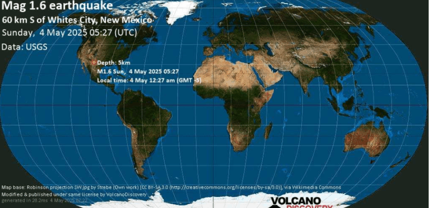 Le séisme le plus fort enregistré ce dimanche, il y a six heures, est un tremblement de terre de magnitude 5,4 survenu dans le comté de Culberson, au Texas, à 89 km au sud de Carlsbad, dans le comté d’Eddy, au Nouveau-Mexique, États-Unis.