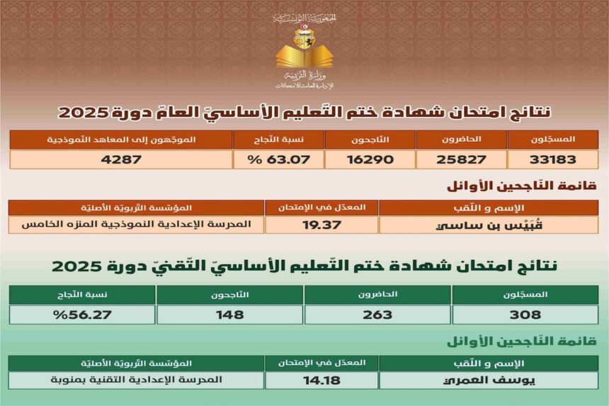 Le taux de réussite à l’examen du diplôme de fin de l’enseignement de base général « Neuvième », session 2025, a atteint 63,07 %, sur un total de 25 827 candidats, parmi lesquels 4 287 ont été orientés vers les collèges pilotes, a annoncé le ministère de l’Éducation.