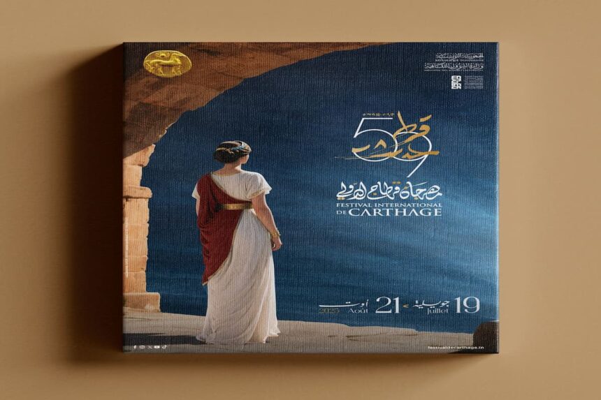 La page officielle du Festival international de Carthage a dévoilé l’affiche de sa 59ème édition. Selon la même source, l’affiche a été imaginée par le graphiste Atef Maazouz. Elle s’inspire d’une œuvre en calligraphie arabe signée par l’artiste tunisien Amor Jomni.
