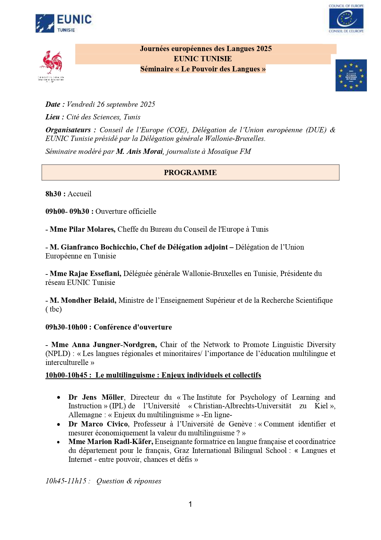 Dans ce contexte, l’EUNIC Tunisie (European Union National Institutes for Culture), le Conseil de l’Europe et la Délégation de l’Union Européenne célébreront la Journée Européenne des Langues (JEL) les 26 et 27 septembre 2025. Cette année, le thème sera « Le pouvoir des langues». Il met en avant le rôle crucial de la pluralité à la fois culturelle et linguistique dans la mise en valeur du multilinguisme et de préservation du patrimoine.