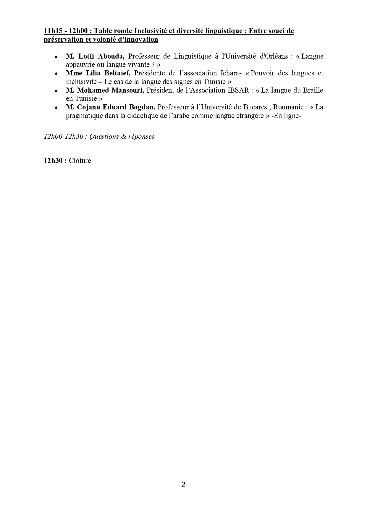 Le programme de la première journée axé sur le pouvoir des langues, explore des thèmes variés tels que les enjeux individuels et collectifs du multilinguisme, sa valeur économique, son impact social, et les questions d’inclusion, notamment avec l’implication d’associations tunisiennes telles que Ibsar pour les non voyants. Autrement dit, l’objectif est de promouvoir un programme d’échanges et d’activités linguistiques.