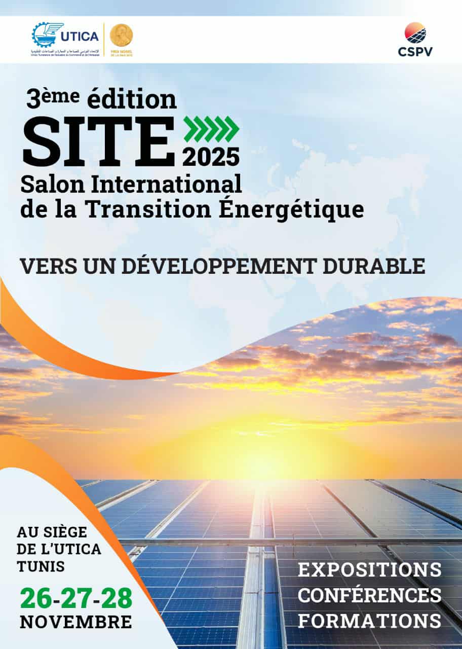 Afin de nourrir le débat national sur le renforcement de l’investissement dans les énergies renouvelables, de valoriser les solutions technologiques innovantes et de mettre en avant les grands projets prévus pour diversifier et développer la production énergétique en Tunisie, la Chambre nationale de l’énergie photovoltaïque, relevant de l’ UTICA, organise la 3ᵉ édition du Salon international de la transition énergétique, qui se tiendra du 26 au 28 novembre 2025 au siège central de l’UTICA à Tunis.