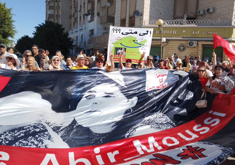 Akila Dridi, membre du comité de défense d’Abir Moussi, rappelle que ce rassemblement survient deux ans après le mandat de dépôt lié à l’affaire du bureau d’enregistrement au palais présidentiel, où Abir Moussi a déposé des recours contre des décrets présidentiels relatifs aux élections locales. Agissant à la fois en tant que cheffe d’un parti d’opposition, avocate et citoyenne, elle s’est présentée accompagnée d’un huissier et d’un avocat, mais a néanmoins été poursuivie en vertu de l’article 72 du Code pénal.