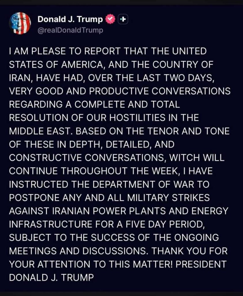 Ainsi, dans une décision spectaculaire, le chef des Etats-Unis a ordonné au Département de la Guerre de reporter toutes les frappes militaires. A savoir, plus précisément, celles prévues contre les centrales énergétiques iraniennes et les infrastructures critiques.