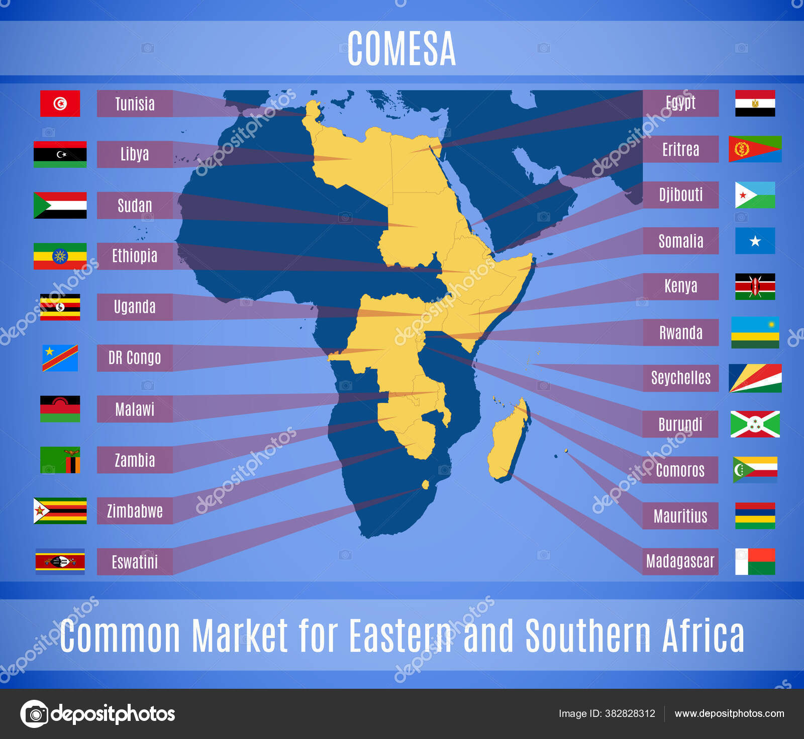 Les 21 États membres sont : la Tunisie, la Libye, l’Égypte, le Burundi, les Comores, la République démocratique du Congo, Djibouti, l’Érythrée, l’Eswatini, l’Éthiopie, le Kenya, Madagascar, le Malawi, Maurice, l’Ouganda, le Rwanda, les Seychelles, la Somalie, le Soudan, la Zambie et le Zimbabwe.