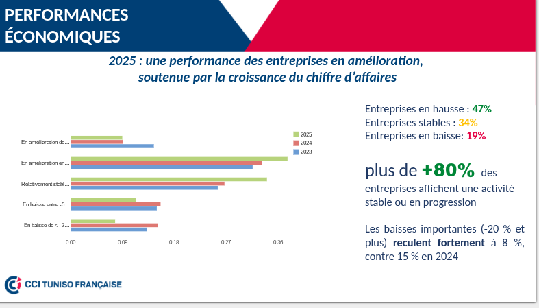 La Chambre de commerce et d’industrie tuniso-française (CCITF) a présenté, lors d’une conférence de presse mardi 7 avril 2026, la troisième édition de son baromètre économique. Il est mené auprès de 167 entreprises tunisiennes et françaises opérant entre les deux pays. Réalisée du 15 décembre 2025 au 5 mars 2026, l’enquête évalue l’évolution du chiffre d’affaires, les perspectives d’investissement, l’impact de la conjoncture et les transformations en cours. Et ce, notamment en matière de digitalisation, de RSE, de ressources humaines et de cadre réglementaire.