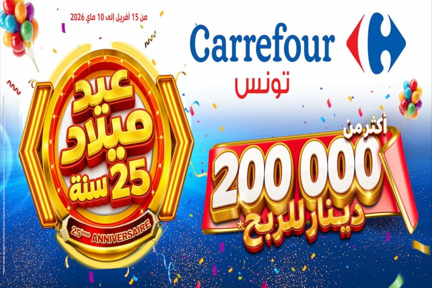 À l’occasion du 25ᵉ anniversaire de ses hypermarchés, Carrefour Tunisie organise une opération exceptionnelle du 15 avril au 10 mai 2026. Elle se déroulera dans ses magasins Carrefour La Marsa, Carrefour Mall of Sousse et Carrefour Mall of Sfax.